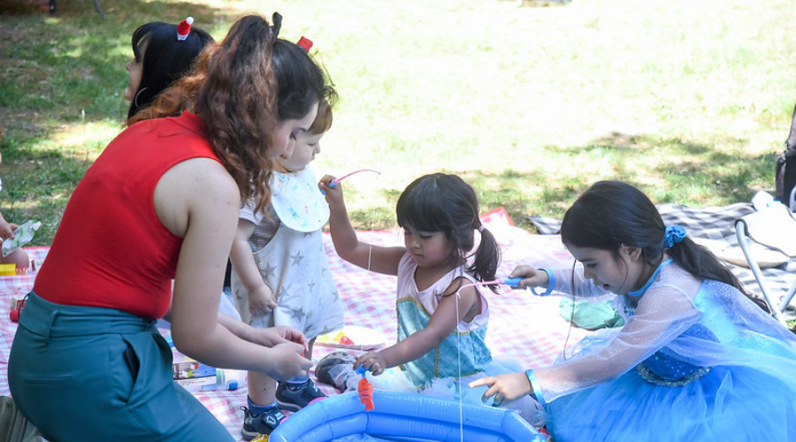 Con el ambiente ya en marcha, los niños y niñas mayores y preescolares participaron en yincanas adaptadas a sus rangos etarios, mientras los bebés exploraban un sector de juegos junto a sus cuidadores. Hubo dibujos para colorear, pesca milagrosa y bloques de construcción, actividades que llenaron de movimiento y risas el patio. En paralelo, las y los adultos contaron con un espacio cómodo y ligero para conocerse, compartir experiencias y apoyos, destacando lo especial que resultaba contar con una instancia universitaria pensada para la vida familiar.