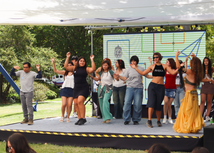 En el escenario principal, los/as novatos/as pudieron disfrutar de concursos, información útil, muchos premios y demostraciones de diferentes disciplinas artísticas. Las profesoras de Danza Árabe y Ritmos Latinos, ambos talleres artísticos que ofrece la DAE, trajeron el ritmo y entretención, haciendo bailar a muchos/as asistentes. También el grupo de danza, The Asset, conformado por estudiantes UC, sorprendió con ritmo y acrobacias en sincronía de hits urbanos.