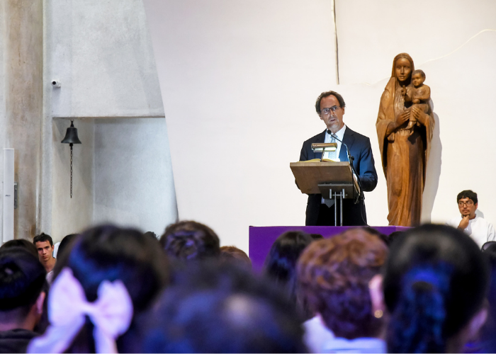 “Entrar a la UC es un privilegio. No sólo por la excelencia académica que hemos cultivado durante más de un siglo o el prestigio que otros nos reconocen desde afuera, sino por algo más alto, porque somos una comunidad que se impone una tarea alta y concreta: servir a Chile desde el conocimiento, la reflexión, la creación y un compromiso real. Deben comprender que el talento es un don que se cultiva al servicio del país”.