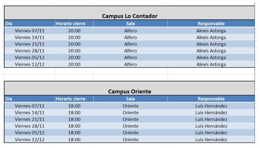 A partir de esta actualización, ¡Todas las salas ampliarán su horario de funcionarmiento los días viernes, según la programación definida para cada campus.
