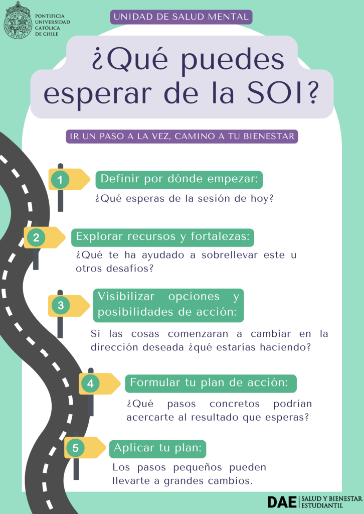 El Servicio de Orientación Inmediata (SOI) es un espacio terapéutico breve, de una sesión, pensado para acompañarte en momentos en que necesites orientación psicológica. En este encuentro podrás conversar con un/a psicólogo/a sobre una inquietud o preocupación específica, y juntos/as elaborarán un plan de acción con pasos concretos que contribuyan a tu bienestar.